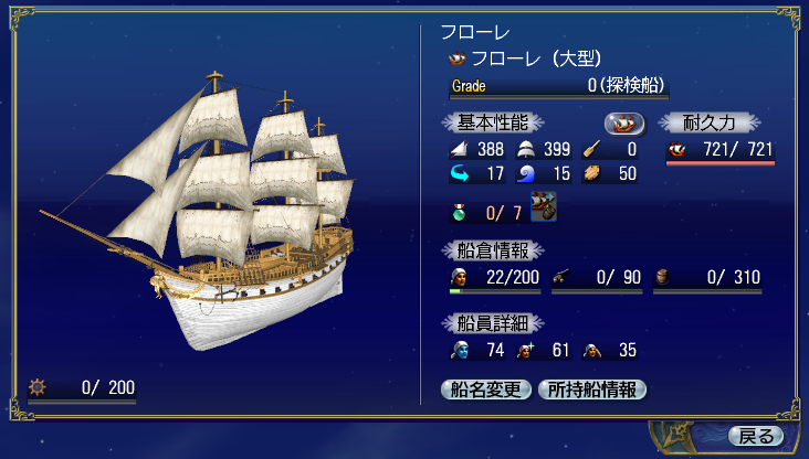 スキル効果:操帆[+3] 操舵[+3] 機雷発見[+2] 装備効果:航行速度上昇[ランク8] |