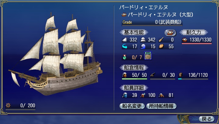 | 高速輸送Special | 一定時間、航行速度が上昇する。発動時、所持している交易品の分類数に応じて効果が上昇する。 |