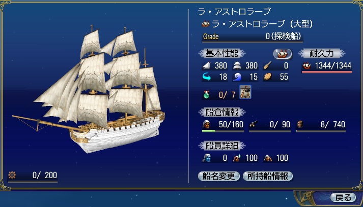 スキル効果:操帆[+3] 航行技術[+3] 錬金術[+3] 装備効果:災害発生率減少[ランク11] |